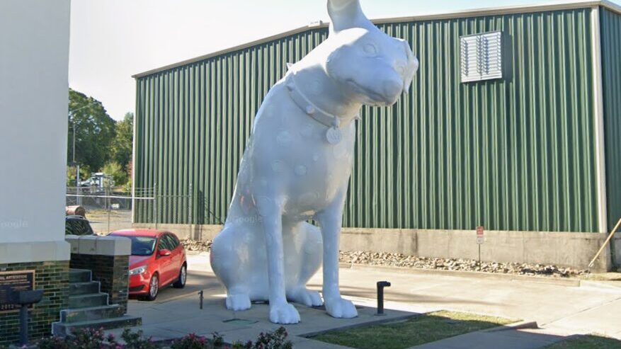 Downtown Shreveport has a 19-foot-tall Dalmatian statue covered in 254 glowing spots. His name tag reads “Art.”