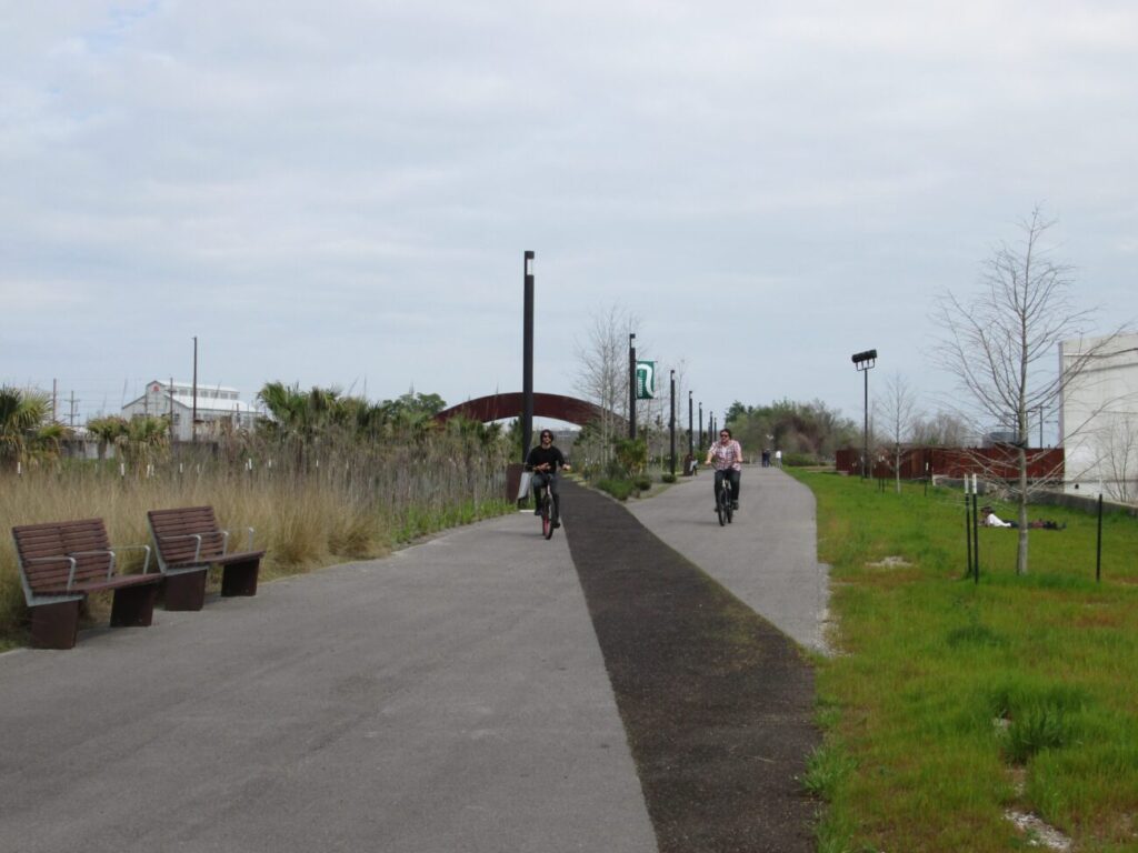 The Piety Street Bridge — locally called the Rusty Rainbow — arches in a dramatic curve over the active rail corridor and floodwall to connect the Bywater to the park’s midpoint. From the top of the bridge, you get an unobstructed view of the river’s bend and the full industrial reach of the working port. The 1.4-mile trail runs from Elysian Fields Avenue to Mazant Street and takes about 40 minutes at a walking pace. Free and open daily; enter at Elysian Fields, Piety Street, or Bartholomew Street. The Piety and Bartholomew entrances have free parking lots.